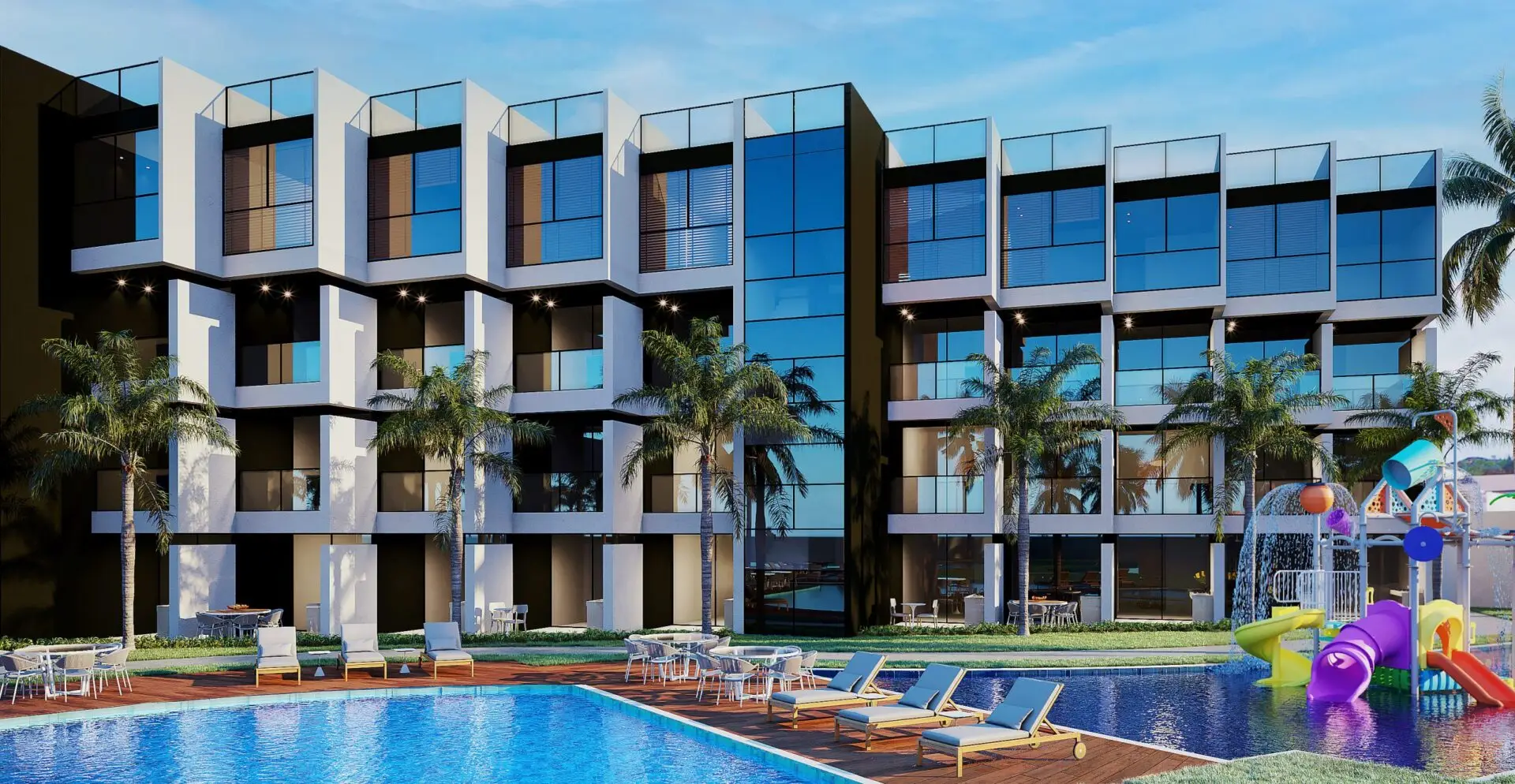 Valorização do imóvel, diferencial competitivo no momento de aluguel da unidade e uso dos complexos para sua própria diversão com a família.